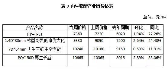 本周,卓創(chuàng)監(jiān)測的再生聚酯四個產(chǎn)品整體走勢全部上漲。本周再生PET市場繼續(xù)上行,價格刷新年內(nèi)高點,周均價環(huán)比漲1.94%;再生普纖主流市場行情維持上漲走勢,局部地區(qū)價格也有上調(diào),周均價環(huán)比漲2.64%;再生中空主流市場行情穩(wěn)中探漲,局部地區(qū)出貨一般,周均價環(huán)比漲0.59%,再生長絲市場維持上漲走勢,價格高居萬元之上,周均價環(huán)比漲2.89%。