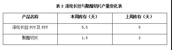 本周,滌綸長絲POY及FDY與聚酯切片的庫存分別為5.5和1.5天。滌綸長絲本周庫存較上周上漲0.5天,聚酯切片庫存較上周下滑0.5天。