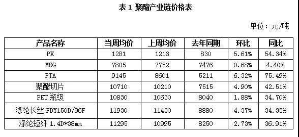 本周,卓創(chuàng)監(jiān)測的聚酯產(chǎn)品及原料板塊中產(chǎn)品全部上漲。漲幅第一位的是PTA,環(huán)比上漲6.32%,本周因PTA現(xiàn)貨維持高升水結構,在補升水行情推動下PTA期貨延續(xù)漲勢。