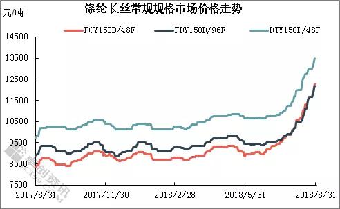 滌綸長絲市場行情連續(xù)10周上漲。截至本周四,常規(guī)品種POY150D/48F、DTY150D/48F、FDY150D/96F周均價分別為11965元/噸、13240元/噸、11930元/噸,較上一報告周期環(huán)比上漲4.04%、2.72%、4.37%。